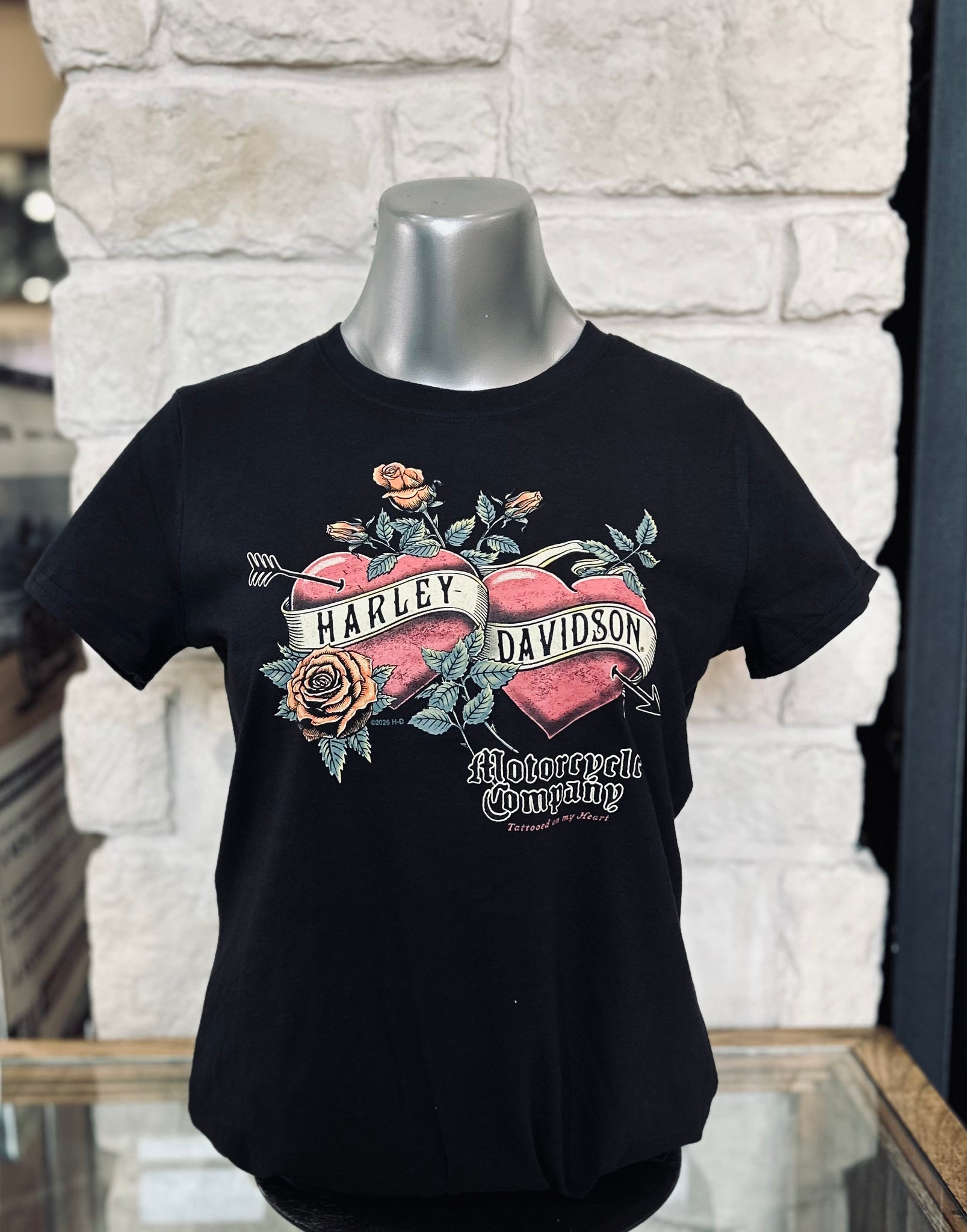 - Black tee with a vintage heart and rose Harley-Davidson design